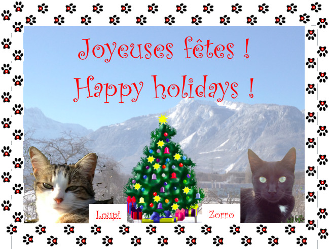 A tous nos copains poilus qui lisez notre blog et le commentez (et à tous ceux qui le lisent sans le commenter 😉 ), nous vous souhaitons de joyeuses fêtes de fin d’année ; que le Père Noël vous donne des jouets marrants, que vos bols soient remplis avec du saumon et du thon chaque jour, et que l’herbe-à-chats ne manque jamais ; que santé, bonheur et prospérité vous accompagnent vous et votre famille pour la Nouvelle Année !